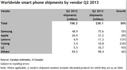 Canalys發(fā)布的報(bào)告顯示,今年第二季度,三星和蘋(píng)果智能手機(jī)出貨量的同比增幅分別達(dá)到55%和20%,占據(jù)出貨量排名前兩位;而聯(lián)想、宇龍和LG則分列三到五位。第二季度,中國(guó)排名前五的智能手機(jī)生產(chǎn)商(聯(lián)想、宇龍酷派、華為、中興和小米)在今年第二季度的出貨量占到了全球總出貨量的20%,去年同期該份額不足15%。
