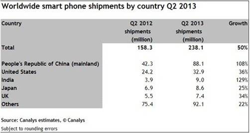 北京時(shí)間8月6日消息,據(jù)國(guó)外媒體報(bào)道,全球著名市場(chǎng)研究機(jī)構(gòu)Canalys周一公布了今年第二季度全球智能手機(jī)出貨量調(diào)查報(bào)告。報(bào)告顯示,今年第二季度,全球智能手機(jī)出貨量約為2.381億部,同比增幅達(dá)到驚人的50%。中國(guó)市場(chǎng)的手機(jī)銷(xiāo)量目前已占全球手機(jī)銷(xiāo)量的20%,這主要得益于中國(guó)大批量生產(chǎn)的低價(jià)智能手機(jī)銷(xiāo)量的猛增。