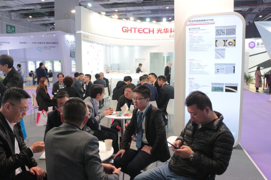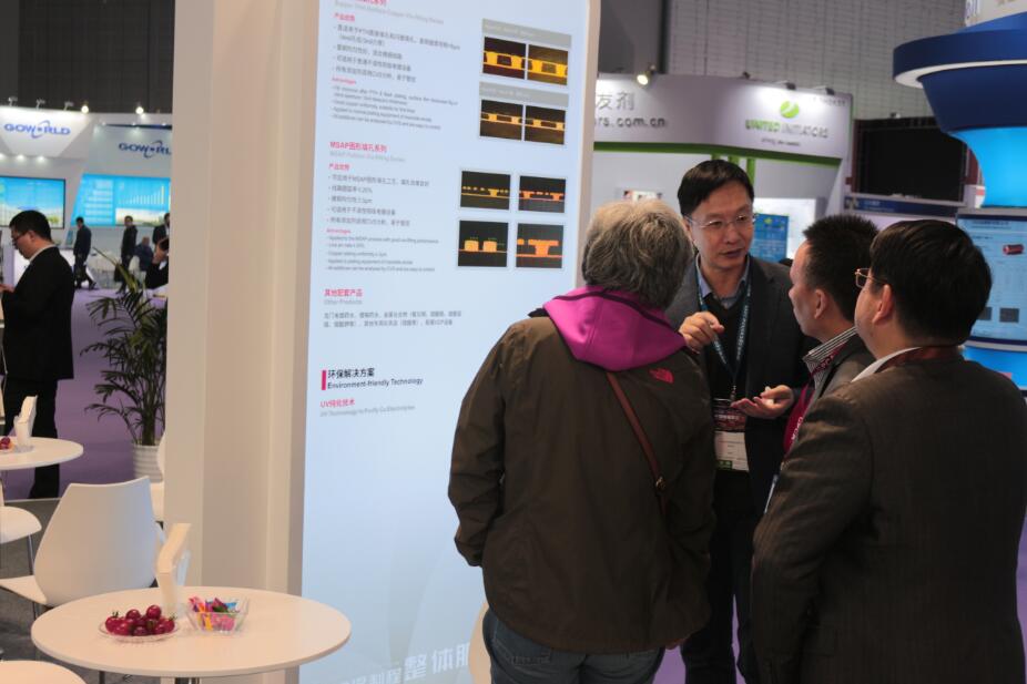 人頭攢動(dòng)的展會中,光華科技在8.1號館,8K46號展臺迎來了產(chǎn)業(yè)鏈上下游的伙伴們。公司此次特別帶來了面向MSAP制程的專用化學(xué)品及5G相關(guān)技術(shù),以及其他PCB濕制程化學(xué)品的新特性,如超薄面銅填孔,MSAP工藝圖形填孔;耐彎折20次以上的軟板化鎳金;適用于5G信號傳輸?shù)某零y、沉錫產(chǎn)品;以及最新的沉厚金產(chǎn)品。