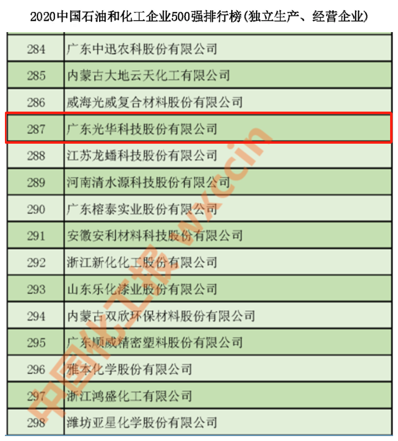 2020中國石油和化工企業500強發布會暨后疫情時代中國化工大企業發展對策高峰論壇在北京圓滿舉行。會上發布了2020中國石油和化工企業500強排行榜,以及2020年中國石油和化工行業發展指數。光華科堅持以客戶為中心,以技術創新為第一動力,憑借穩健的經營管理策略與高質量發展成效,再次榮登中國石油和化工企業500強排行榜單,在“獨立生產、經營企業類"中位居第287位,較2019年上升了166位。