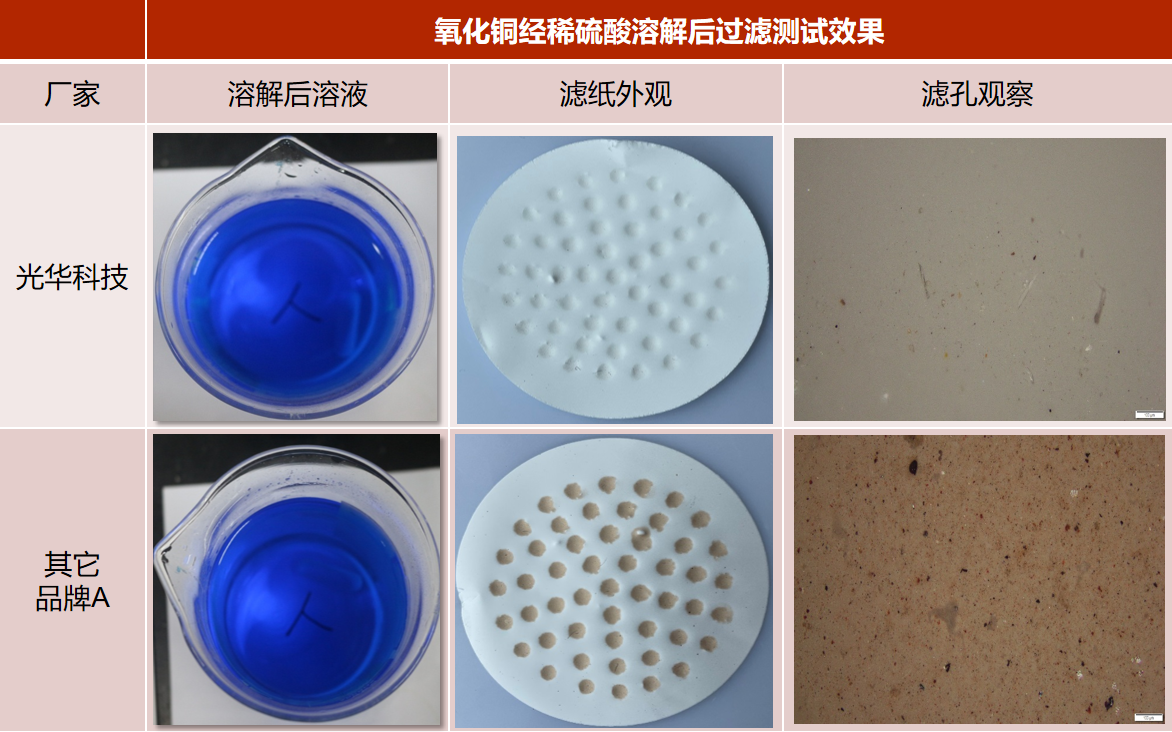 光華科技氧化銅溶解后,鍍液中不溶性物質(zhì)少,可減少銅層粗糙