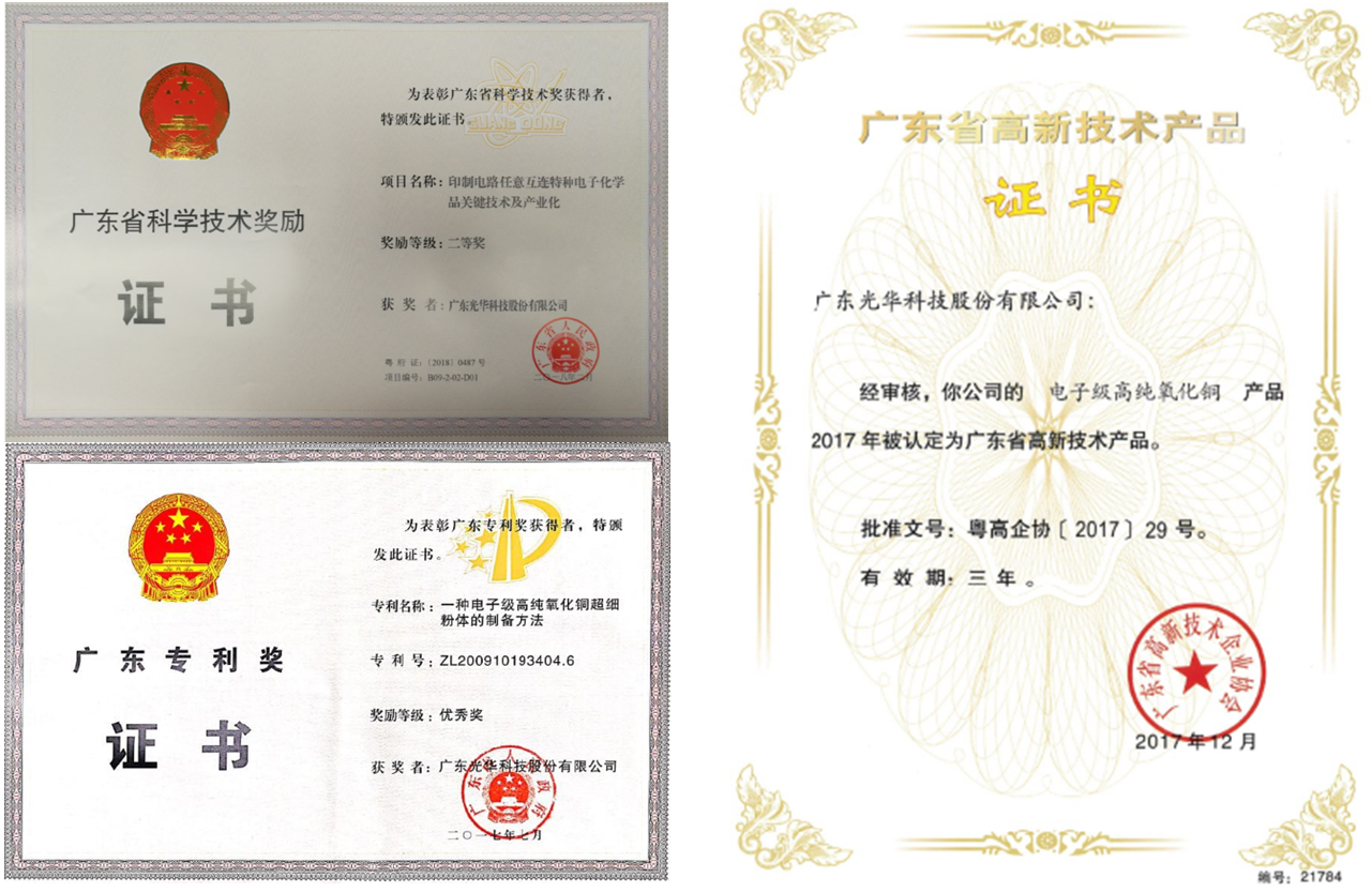 憑借雄厚的研發(fā)實(shí)力、先進(jìn)的生產(chǎn)技術(shù)、獨(dú)特的制備方法和優(yōu)異的性能指標(biāo),光華科技高純電子級(jí)氧化銅曾獲得美國(guó)授權(quán)專利證書,并獲得由政府單位評(píng)定的榮譽(yù)資質(zhì)——由廣東省知識(shí)產(chǎn)權(quán)局頒發(fā)的“廣東省專利銀獎(jiǎng)”、由廣東省人民政府頒發(fā)的“廣東省科學(xué)技術(shù)二等獎(jiǎng)”、由科學(xué)技術(shù)部頒發(fā)的“國(guó)家重點(diǎn)新產(chǎn)品”等多項(xiàng)獎(jiǎng)勵(lì)與稱號(hào)。今年中國(guó)品牌日,光華科技高純電子級(jí)氧化銅又再次獲得美譽(yù),成功入選“國(guó)貨新品”目錄。這是對(duì)光華科技電子級(jí)氧化銅一個(gè)有分量的肯定,也充分體現(xiàn)了光華科技不斷滿足客戶需求和市場(chǎng)發(fā)展,對(duì)產(chǎn)品技術(shù)迭代升級(jí)與創(chuàng)新的不懈追求。