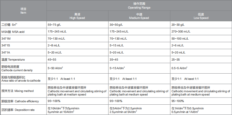 3471是針對(duì)連續(xù)鍍特點(diǎn)而專(zhuān)門(mén)設(shè)計(jì)的霧錫藥?,可以在保證高電鍍效率情況下得到致密均勻的鍍錫層,從而保證產(chǎn)品具有優(yōu)異的抗變色性和可焊性,適用于卷對(duì)卷 連續(xù)鍍霧錫工藝。